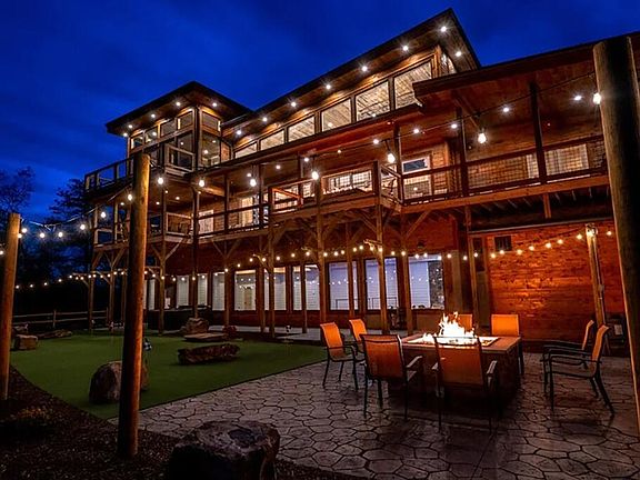As you enter this beauty under the large portico by the front entrance, this sprawling 6-bedroom, 7½-bathroom cabin has over 6,000 square feet of space to accommodate over 25 guests with 5 king beds, 2 futons, 3 sleeper sofas, and 2 triple bunk beds is situated over 3 acres.