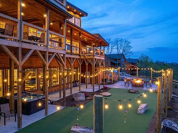On the lower level, you'll have a larger firepit area on the patio plus a picnic table and loungers to kick back in the great outdoors. To further relax, hop into the bubbly hot tub with massaging jets! For more fun, mozy on over to the 6-hole mini-golf course that's covered in astroturf and features stone obstacles. Fairy lights adorn the entire area so you can play, relax, and enjoy nature at night, too.
