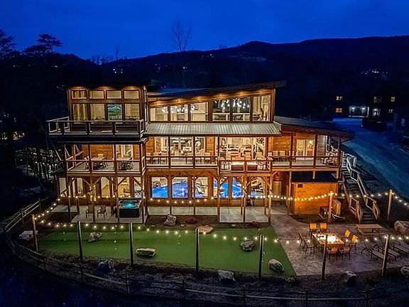 When you're not sitting back and enjoying the stunning mountain views or whipping up a delicious meal in the fully equipped double kitchen, have some fun shooting pool or playing shuffleboard in the rec loft, or practice your putting skills on the 6-hole mini-golf course outside. Splash around in the luxurious indoor pool — featuring bridges, waterfalls, grottos, spa jets, underwater lights, and a lazy river! The theater room with a big screen TV is great for movie nights, and of course, this property has high speed internet.