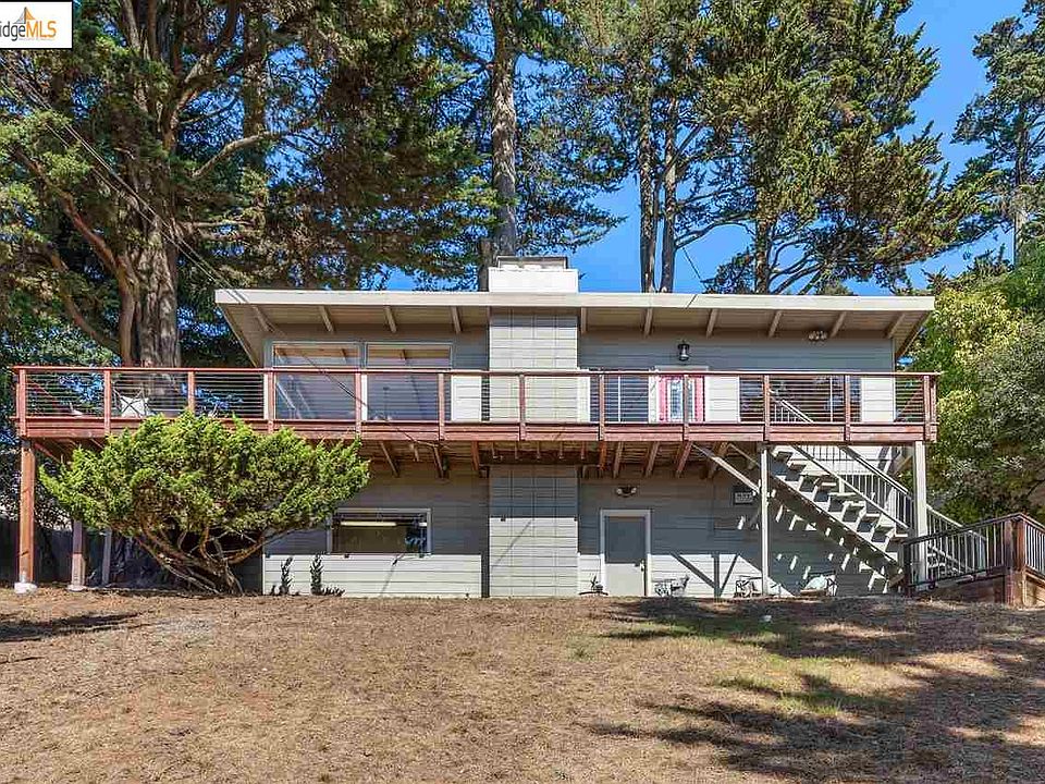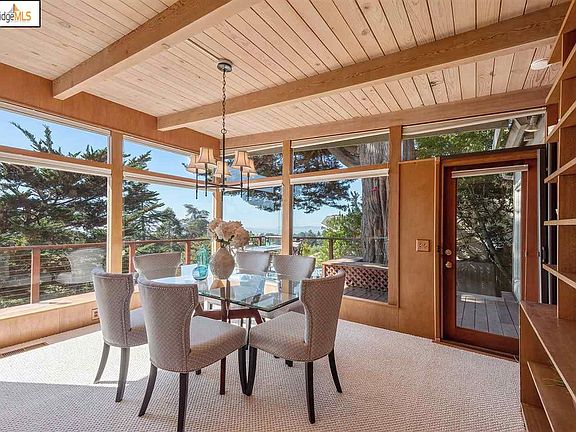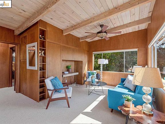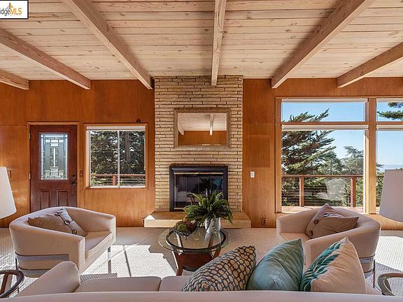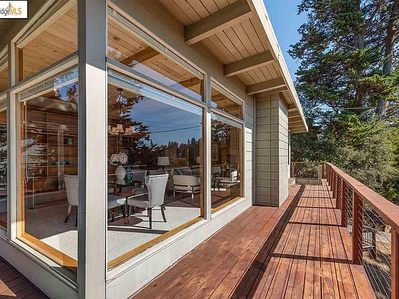 Dramatic views of the SF Bay from this authentic Mid-Century home make this an inspiring retreat.  The open floor plan greets you with panoramic windows, light, and views all around the Bay.  A raised hearth fireplace, wood-beamed ceilings & incredible Mid-Century wood detailing throughout earned the home many features in Sunset Magazine. The kitchen with its vaulted ceilings, wood cabinetry, ceramic tiles and breakfast bar makes for a practical space that opens to a back deck while also enjoying the views from the expansive great room. Dubbed the Tree House, when you sit on the large front deck with its private view, you too will experience the serene pleasure of your own private getaway with a canopied view that takes you away from it all. With two large bedrooms, both with an en-suite bathroom, skylight & lots of light and space. One bedroom has a walk-in closet, the other a custom California Closet built-in. Add'l. office/basement! Close to the village & Freeway.