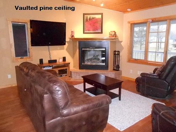 Less than a mile from town is this newer ranch style home on 1.14 acres. Beautiful LR featuring wood burning FP, vaulted pine ceiling, unique black walnut wall and huge picture window overlooking yard and covered porch. BA with deep soaking tub and shower stall. Well-planned KT w/maple cabinetry, built-in desk/work center and ''Corian'' counters. Rustic knotty pine 6 panel doors throughout. Main flr lndry. Garage offers over 780 additional heated square footage designed for future living space if desired.