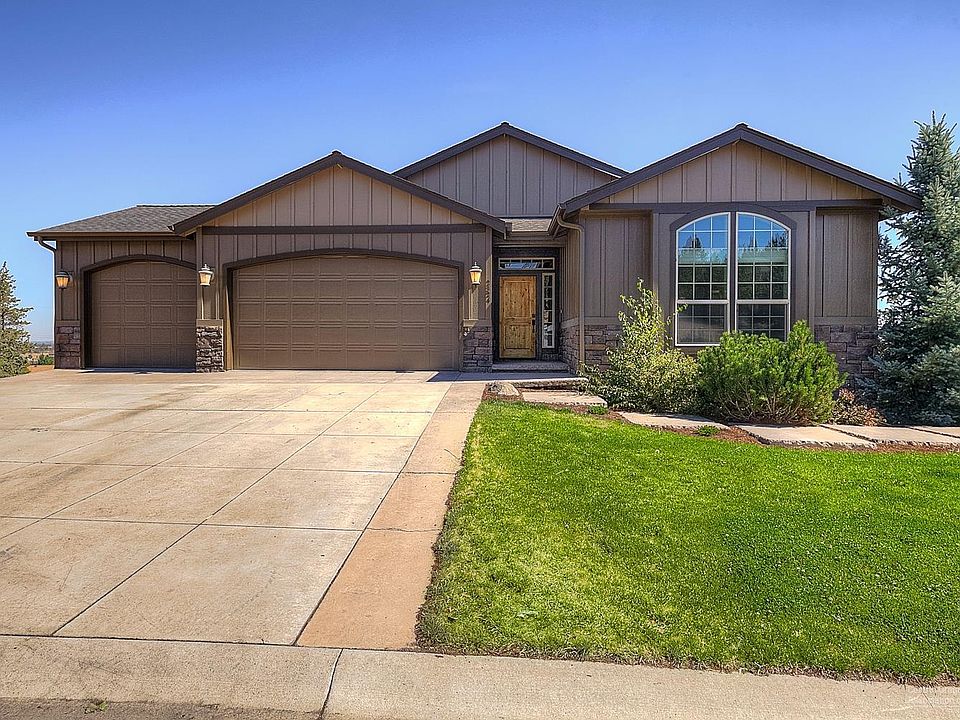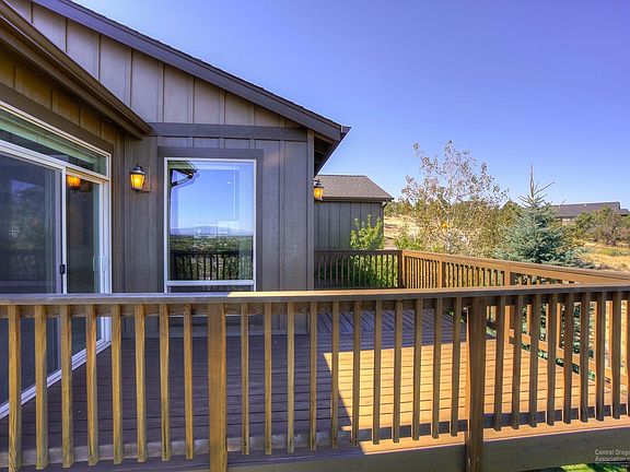 Gorgeous views of Smith Rock and the city from this Northwest Contemporary! Great room plan with tile entry, vaulted ceilings and gas fireplace with stone accents. Kitchen with granite counters, island with breakfast bar, built-in desk, hardwoods and gas appliances. Loaded with upgrades and luxury finishes throughout. Large utility room with lots of cabinetry for storage. Huge extra storage room in basement and triple car garage.