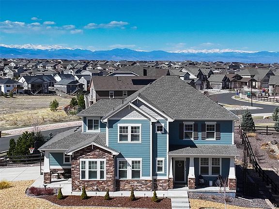 Welcome to your dream home in the sought-after Inspiration Neighborhood! This stunning 4-bedroom, 4.5-bath residence is set on a premium corner lot, offering breathtaking mountain views including iconic Pikes Peak. Inside you'll find a bright & inviting interior spread across 5,248 square feet of living space. The heart of the home is the beautifully designed kitchen featuring custom soft close cabinetry, two pantries, gorgeous granite counters & a glass tile backsplash. Culinary enthusiasts will love the large center island with ample drawer storage & a separate beverage fridge. Additional amenities include designer lighting, a gas stove, double ovens, a new dishwasher & microwave & a spacious breakfast nook with a functional built-study station. Adjacent is the dramatic two-story living area complete with plantation shutters & a striking stone fireplace for warm relaxation on those cold Colorado nights. Off the inviting entryway is a well placed home office with charming barn doors & a formal dining room that is bathed in natural light & is perfect for entertaining. A functional mudroom off the garage entry offers a "drop zone" upon entering the home & is flanked by the private powder bath. Unique to this model is a main floor in-law suite w/ en-suite bath, in room wet bar & a separate entrance for privacy & convenience. Upstairs the secluded primary suite offers serene mountain views from a huge private balcony. The attached primary bath is a luxurious retreat w/ soaking tub, custom tile shower & dual walk-in closets. Two additional bedrooms with a Jack and Jill bath and a versatile loft space complete the upper level. The basement features 10 ft ceilings creating an open & airy feel. It's an entertainer's paradise w/ wet bar, poker room, media room & game room. The home gym space can easily be converted to a fifth bedroom with its connected full bathroom. Outside enjoy the privacy of the large corner lot w/ abundant landscaping, hot tub & private covered patio.