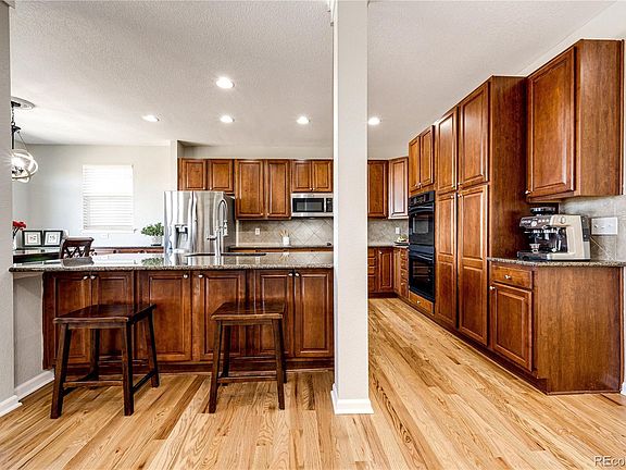 Located in the Villages of Parker neighborhood, this home features 4 bedrooms, 4 bathrooms and a main floor office! This very bright and open floor plan greets you with beautiful brand-new hardwood floors throughout the main level. Very spacious gourmet kitchen with 42” cabinets, slab granite countertops, a huge island, title backsplash and double ovens. Eat-in space off of the kitchen with built-in buffet cabinets and patio doors leading out onto your upper level deck area! Enjoy relaxing in your front living room area or in the family room with a cozy fireplace to keep you warm on a chilly Colorado night! Has a formal dining room. Separate area for laundry, lots of cabinets and a sink! The upper level has 4 bedrooms with a large primary bedroom, 5-piece bathroom with a huge custom walk-in closet! Primary bedroom has stunning views of the mountains and downtown Denver. From the other upper level bedrooms, you have views of Devils Head & Pikes Peak! Tons of potential with a full unfinished walk-out basement and a lower level covered patio area. Large backyard with fencing all around. Located within walking distance to schools, miles of trails & parks, a golf course and a nearby pool. All you need to do is move in and make this your happy home!