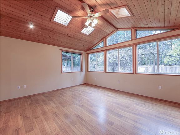 Hard to find spacious 2346 sq ft RAMBLER w/ 2 car garage, covered RV parking, all on huge 21,344 sq ft Lot. Featuring 3 Bed rooms, 2 full bath w/ den & a loft. Master features slider to private patio & access to hot tub & fully fenced back yard. Don't miss the tree house! Open concept floor plan w/ an over-sized utility room, free standing wood stove & Heat Pump. Extremely lg family room features skylights & lots of natural light & french doors. Min to Sm Point shopping, schools & lakes.