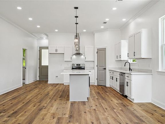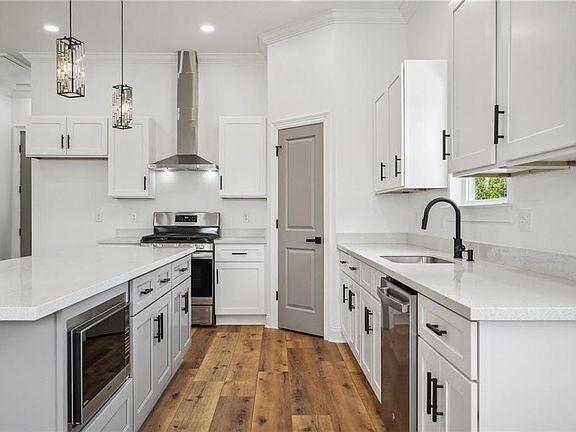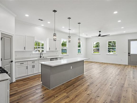 Stunning constructions awaits in this new home offered at a bargain price! Living & Kitchen areas are completely opened for a bright & airy feeling featuring 10 ft. ceilings, crown moldings, 8 ft. entry doors, recessed lighting & 65" ceiling fan. Entertain from your oversized 8 ft. quartz top island w/ crystal pendant lighting. Adjacent the living area is the nicely equipped kitchen w/ SS appliances including gas stove w/ gourmet vent hood, island mounted microwave, white/gray shaker cabinets including hardware, & spacious pantry. So many upgrades including smart hands free entry lock, wifi thermostat, on-demand gas water heater, black finish plumbing/electrical & cabinet hardware, gray interior accent doors, & waterproof flooring throughout. Both spa-like bathrooms offer back-lighted touch mirrors, deep vinyl tubs w/ custom tile to ceiling surrounds, storage niches, & matching bath accessories. The master is large showcasing tray ceiling w/ 65" ceiling fan, & walk-in closet w/ amazing custom organizer storage behind a coordinating gray wooden barn door. As if it could not get better, the huge laundry area features a deep sink w/ cabinet, gas & electric hook-ups, & is ready to install your second refrigerator/freezer. No need purchasing used when you can get everything new a warrantied. Located in a preferred "X" Flood Zone meaning reasonable & optional insurance! Seller is Owner/Agent.