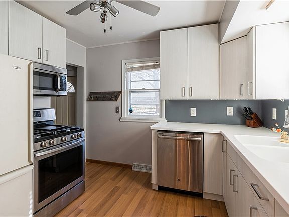 Two Bedroom craftsman style bungalow with built-in bookcase with glass doors. . Original trim in living room and dining room, enclosed three season front porch. The updated kitchen has Corian counters and sink, under cabinet lighting, and modern style cabinetry. Several windows have been replaced and house roof was replaced in 2019. The backyard is fully fenced and features great patio space. Oversized 2- car garage makes this home a great place to call home. Blocks from Grandview College and Union Park. All information obtained from Seller and public records.