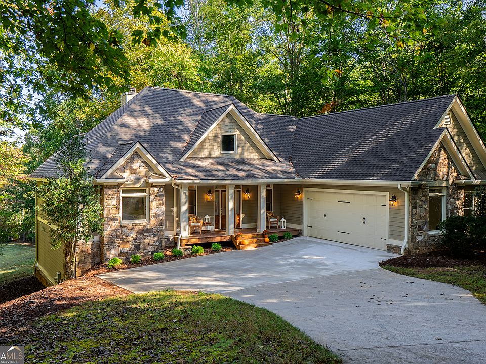 Nestled in a serene gated subdivision less than 5 minutes from Lake Chatuge in the North Georgia mountains, this lovely craftsman-style home sits on a sprawling 2.85-acre wooded lot, complete with a tranquil creek and peaceful mountain views. Experience superior craftsmanship throughout this exquisite 4-bedroom, 3.5-bath residence, highlighted by two stacked stone fireplaces and a formal dining room adorned with an elegant coffered ceiling. The gourmet kitchen has granite countertops and a new gas cooktop, new microwave and dishwasher, rich cherry cabinetry, and a bright breakfast room that opens to a private deck, perfect for enjoying the peaceful sounds of nature and the picturesque mountain backdrop. The main-level primary suite features a tray ceiling, bay window, and an en-suite bath with a soaking tub, walk-in shower and double vanity. Recent improvements include a new roof and gutters, all-new interior and exterior paint, and new carpeting throughout. The terrace level offers a spacious media room, three generous bedrooms-one featuring a gas fireplace and the other with an en suite bathroom-plus ample storage. Complete with a charming courtyard driveway and an oversized 2.5-car garage, this home is the ultimate retreat for those seeking comfort, elegance, and the breathtaking beauty of the North Georgia mountains.