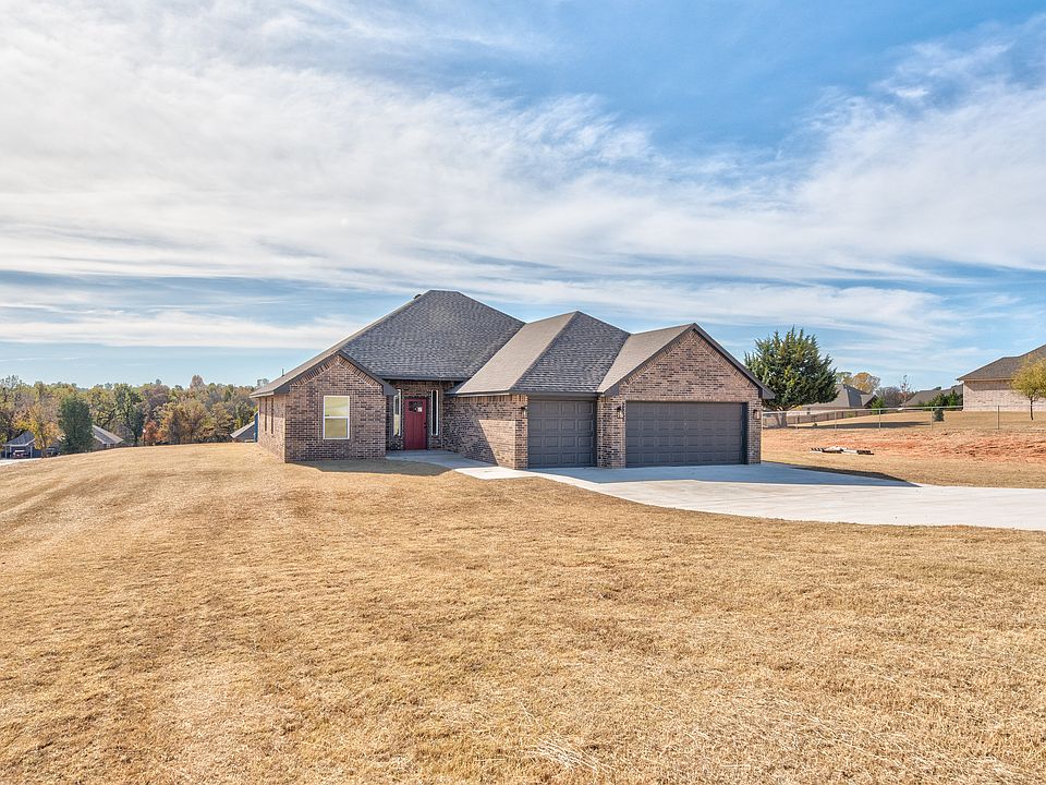 Home sits on 1.03-acre lot in the growing Greys Harbor addition! With a 1,828 square foot floor plan. 4 bedrooms, 2 and a half bathrooms, & 3 car garage. Open floor plan with fireplace. Island, pantry, and stainless appliances in the kitchen. Master bath with large walk-in shower, dual vanities, tub, privacy toilet, and walk-in closet. Covered porch & patio. Full concrete drive. Metal shops allowed! Completed & move in ready! Only three miles from the Winter Creek golf course. Blanchard & Middleberg schools.