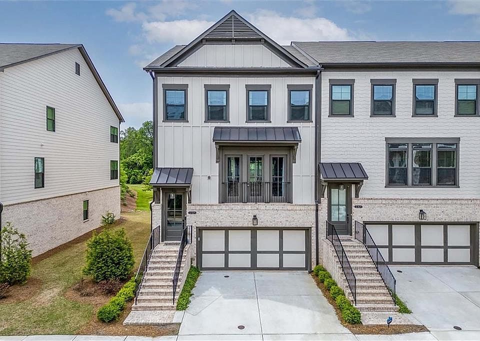 Welcome to luxury living in the highly desirable gated townhome community of Dumont Place! This exquisite 2-car garage END unit offers an abundance of natural light and stunning views of the walking trail green space and wooded surroundings. Spanning three levels, this townhome boasts Grey Alpine Hickory floors throughout, complemented by 10+ foot ceilings. The main level features a custom walk-in pantry with built-in shelving, and an open concept kitchen adjacent to the living room where you will find a stunning fireplace, a focal point with its modern tile surround. The chef's kitchen features upgraded appliances, including a Kitchen Aid 6 burner gas stove, a built in microwave, under cabinet lighting, an oversized quartz island, and a quartz backsplash. The living area opens to a covered deck facing a park like setting, perfect for relaxing or entertaining. Upstairs, the primary suite offers a custom built-in closet with a garment steamer, while the loft area boasts another custom built-in closet, creating ample storage along with the perfect work from home flex space. The primary suite bathroom is oversized and includes a separate freestanding tub, spacious walk in shower, and double vanity sinks. Additional features of the home include upgraded light fixtures on all three levels, smart lighting with recessed dimmer effects, custom built-in wall-to-wall shelving cabinetry in the dining area, all in a walnut stained finish. Adding a touch of rustic charm and functionality, wood floating shelves bridge the foyer and dining area, creating a seamless connection between the spaces. With its spacious layout, luxurious finishes, prime location, and resort style pool, this townhome in Dumont Place offers the ultimate comfort and modern living. Close to I-85, Toco Hills shopping, and Lulah Hills mixed use development!