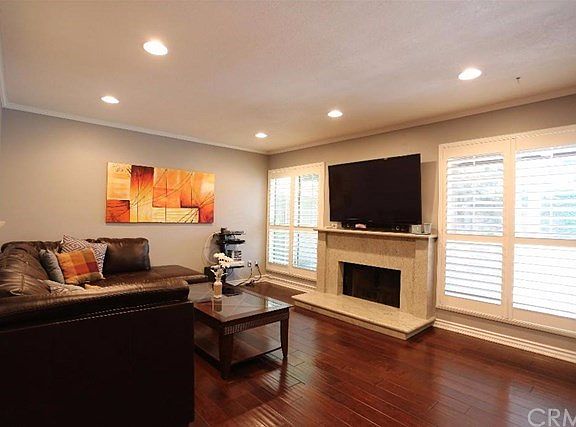 Charming and beautiful 2-story end-unit townhouse with only 1 attached wall. This highly desirable home has been updated with gorgeous finishes, including wood floors, recessed lighting, custom plantation shutters, crown molding, and a lovely granite fireplace. The kitchen has also been remodeled with newer cabinets, glass mosaic back splash, granite counter tops, and stainless steel appliances. The extra large master bedroom features vaulted ceilings, huge walk-in closet, and full bathroom with dual sinks. This home also includes a 2nd bedroom with walk-in closet, an attached 2-car garage, central air conditioning, alarm system, and large front patio space for entertaining. Very low HOA dues that include community pool, jacuzzi, tennis courts, and plenty of visitors parking. The quiet and friendly complex is close to restaurants, shopping centers, and Disneyland.
