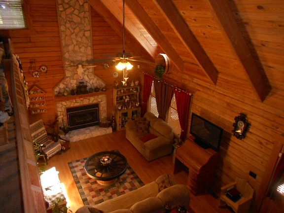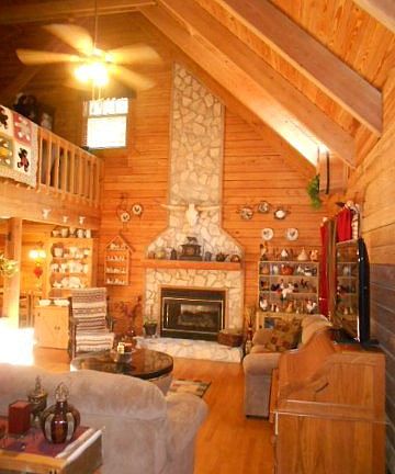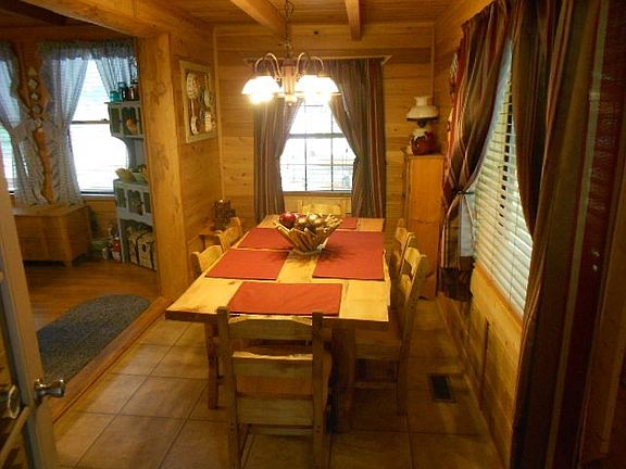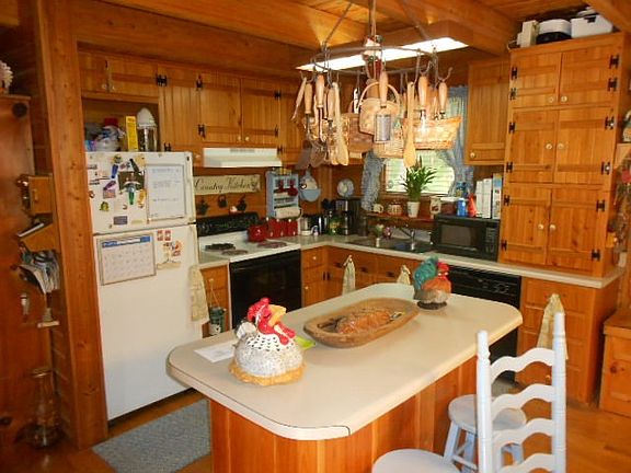 Your own mountain retreat with everything except the mountain. A true cedar log home with all tongue and groove interior. You will love the wrap-around front porch, the gazebo, the outbuildings, outhouse (decorative) workshop and even boat shelter. Interior has stone fireplace with gas logs for heat on demand, hardwood floors. Spacious great room with 20ft plus vaulted ceiling. Large working space kitchen with island and breakfast area. Separate dining room area with tile floors. Master bedroom has it own gas fireplace. Spacious closets and storage area. Stairs lead to open area that overlooks the great room. This could be used as bedroom, also is an over-sized bedroom and bath in addition to this area. The home is very well-maintained and in pristine condition. All you need is the movers. Please take a look at this very unique property. It will not last long. Remember has alarm.
