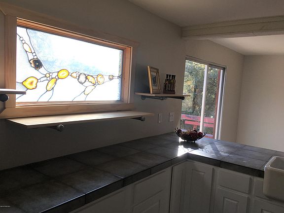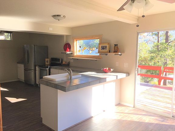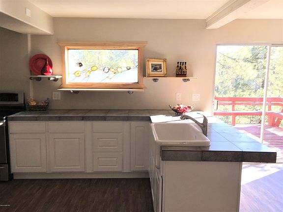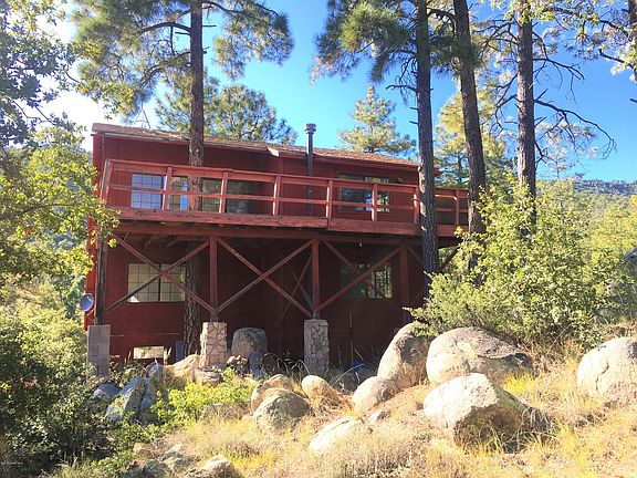 Completely remodeled cabin situated on a hillside double lot, bordering Prescott National Forest. Double wrap around decks with views every direction. Two family rooms, entire 3rd floor is a master suite complete with private balcony, walk in closet & sitting area. Master has a pellet stove to keep you toasty. Two wood stoves on the lower level keeps you toasty warm in the winter. Large remodeled eat-in kitchen, walk in pantry, Formal Dining Area, new flooring & more. Mid-level features a Living Area, 3 bedrooms, full bath & laundry area. All plumbing & electric has been upgraded. Enjoy the views from every room. Easy year round access.There are very few homes of this size in CK. Double lot, .84Acres. Shed is perfect for quad parking. Home sits on a quiet street not far from Main Street