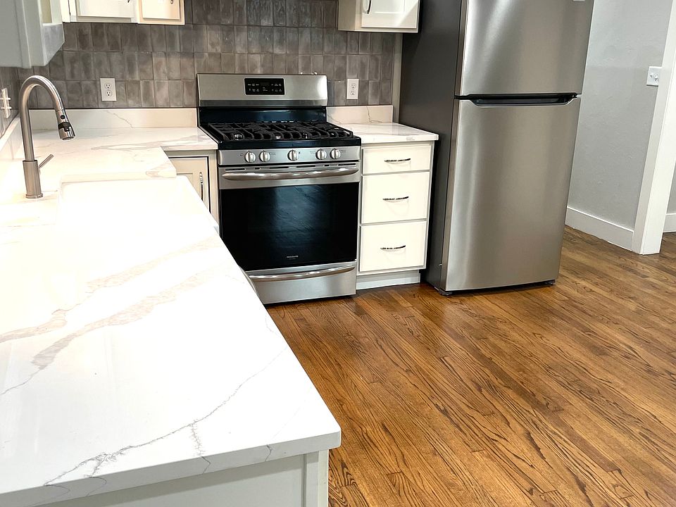 Beautiful 2 bed 1 bath 900 sq ft. Craftsman style duplex. This home has been completely restored including new electrical, plumbing and central heat and air. Kitchen features gorgeous stone counter tops with farmhouse sink and garbage disposal. Subway tile back splash and lots of built-in cabinet space and a full pantry. Appliances are included- refrigerator, dishwasher and gas range with vent hood. Refinished hardwood floors throughout. Ceiling fans in bedrooms.