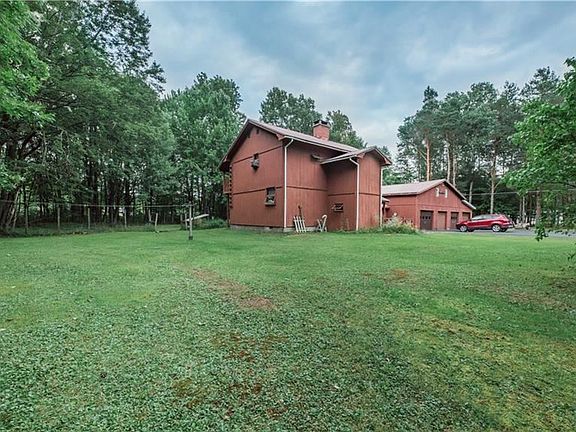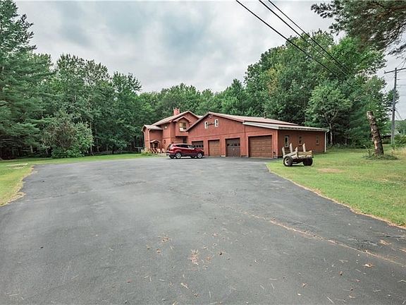 Nestled on a 3.8 acre lot this home has custom finishes abound. The second level features 1 bedroom and a full bath. The cozy kitchen with an island sink and stove opens to a family room with a brick fireplace to a 4 season porch. On the first level there is a full bath, laundry, 2 bedrooms & generous dining room with 2nd fireplace that has a wood stove insert and a 2nd four season porch. Knotty pine tongue and groove throughout. The 2 story, heated 4 stall garage is a motor heads dream come true; room for all your toys & projects. This property has an oil/wood combination boiler, a great yard for relaxation or entertaining and trails through the woods for exploring. Close to four wheeling and snowmobile trails, this house is a must see!