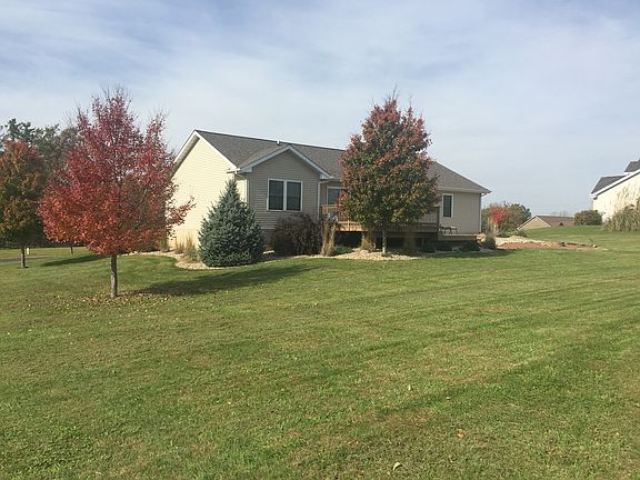 Single owner, lightly lived in ranch on 1 Acre corner lot with gorgeous golf course view, Attached 3 car garage with 8' doors and detached 36x40 fully insulated garage including 10' doors and wired for 220 volt electrical service. High efficiency home built in 2008 with spray in-foam insulation and geothermal HVAC. No propane or gas required. Open concept floor plan with large great room that includes kitchen, dining area and living room with vaulted ceiling. Split bedroom design with large master, 2 bedrooms and 2 full baths on main level. All main level bedrooms include walk in closets. Master bath includes dual, split vanities, private water closet, linen closet, shower and large corner whirlpool tub. Main level laundry room with utility sink and lots of storage cabinets. Kinetico Water Softener, shared well and individual septic. Full basement, Finished in January 2016. Includes large bedroom with full daylight window, Office/Den area, rec room, wet bar with full sink and counter depth french door refrigerator, family room, full bathroom and 2 storage rooms. Active radon mitigation system installed in 2015. Professionally landscaped yard including large two level deck and stone fire pit area, 5 established Red Maple trees with beautiful fall color and 2 established Colorado Blue Spruce trees.