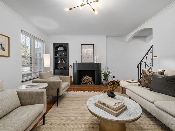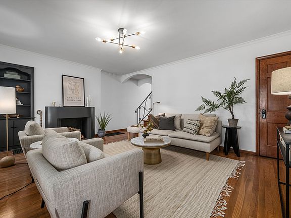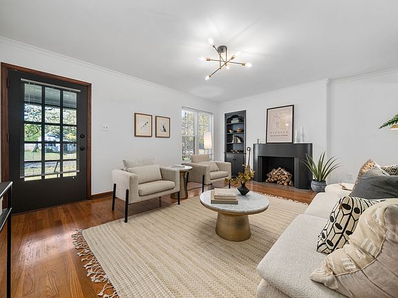 Original hardwood floors, decorative fireplace, and nice built-in shelves.