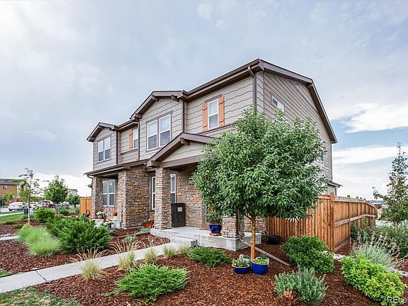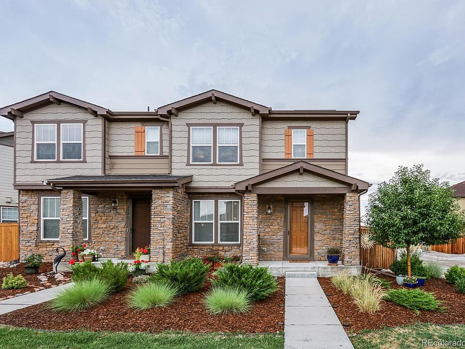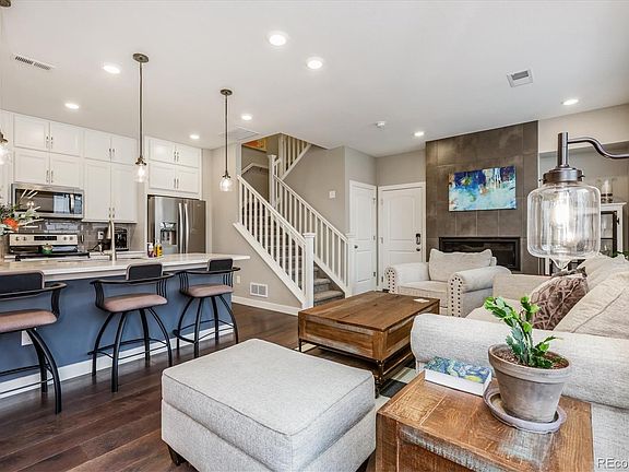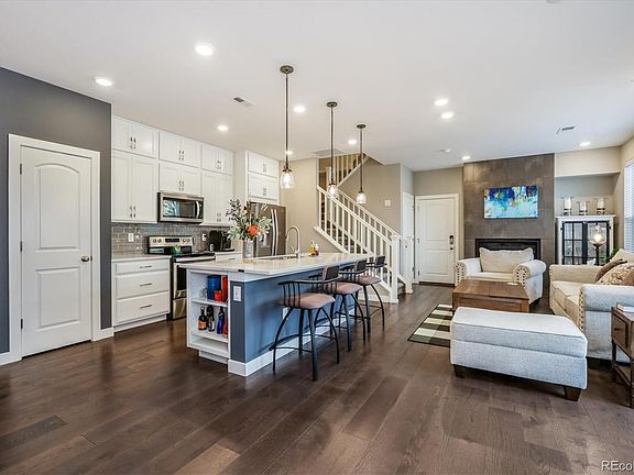 *PRICE IMPROVEMENT* Beautifully designed home in Stratus of Eagle Bend with designer finishes and classic style throughout. This light and bright two-story townhome greets you with an abundance of natural light, tall 10' ceilings, beautiful laminate hardwood floors throughout the main level and an open layout, ideal for entertaining. The well-appointed kitchen boasts upgraded white cabinetry, quartz counters, a pantry, SS appliance package and an oversized center island, perfect for an inviting breakfast bar. The open floor plan transitions the kitchen seamlessly to a dining space, perfect for dinner parties or intimate family meals. Retreat to your spacious primary suite, complete with a bonus sitting area, huge walk-in closet and 4-piece upgraded ensuite bathroom. A large secondary bedroom and full bath, plus a loft which could easily convert to a 3rd bedroom round out the upper level. Stratus of Eagle Bend is ideally located within minutes of Southlands Mall, neighborhood Cherry Creek schools, parks, Saddle Rock golf course, trails and more. Do not miss your opportunity on this amazing townhome, book your showing today!