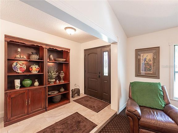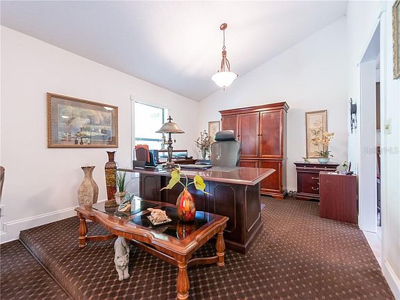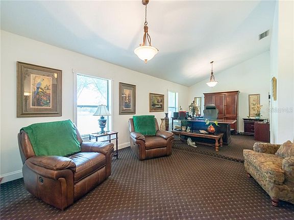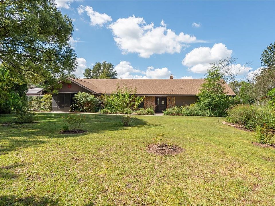 You'll appreciate the beauty of this special place--it's a quiet refuge with a magnificent landscape designed for people, pets,birds and butterflies. PROPERTY INCLUDES: HOUSE, SEPARATE BUILDING, POLE BARN, ACREAGE W/POND. HOUSE: Comfortable 4 bedroom, 3 bath ranch-style home. cathedral ceilings, beautiful stone wall fireplace viewed from the kitchen or spacious dining room. Large kitchen w/skylights, eat-in area. Laundry room w/ cabinets, sink & space 2nd refrigerator. French doors in master & dining room lead to a huge screened patio area which is partially covered for outdoor seating & dining. Generous closet space in all 4 bedrooms. Over sized double attached garage, plus carport for 2 vehicles + golf cart. New windows & doors, AC, well, roofs, tile floors, solar gate, fencing and more.. SEPARATE BUILDING: Apartment, double garage w/ AC, covered patio/screened porch, great for extended family or income property. POLE BARN: with 10'X16' building, perfect for tack, workshop, or playroom. ACREAGE: This amazing property includes a large pond w/ dock, landscape designed w/ selected trees, shrubs & plants that attract all species of birds, butterflies & wildlife. TOTAL 9.6 ACRES: If you are looking for a private retreat close to town you owe it to yourself to visit this home & property. Must see to appreciate!! Can be subdivided : OPTION: 5 Acres and Main home, Apartment and Pole Barn- $479,000