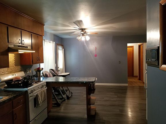 Rural ranch on 0.86 acres. Two stall attached garage and three stall detached garage. Fenced back yard. Roof on home and detached garage updated in 2020. New wood laminate flooring in 2019, new living room carpet in 2019. New garage door and opener. Owned LP Tank, new hot water heater in 2006. Shower in basement. 200 amp electrical service. New septic tank and drainfield in 2021