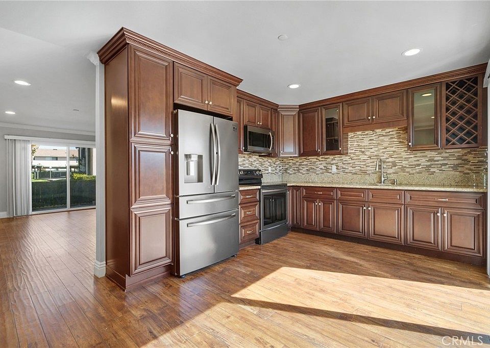 Upgraded and impeccably maintained, this home is ready for you to move right in! 2 bedrooms, 2 bathrooms with a comfortable, spacious layout. The heart of this home is the beautifully remodeled kitchen featuring rich dark wood cabinetry, granite countertops, wine and glass racks, stunning glass doors, and high-end Tuscan stainless steel appliances. This condo includes many enhancements, featuring newer windows and sliding doors, laminate wood flooring, retextured ceilings, elegant crown molding, recessed lighting, and stylish two-panel doors. The bathrooms have also been thoughtfully updated with tile enclosures and flooring, glass doors, and upgraded vanities. What sets this downstairs unit apart is the rare inclusion of three parking spaces, and the conveniently located carport right off your back patio. Two private patios provide outdoor living spaces, with the front one leading to a laundry room equipped for a full-size washer and dryer. The Aliso Creek Villas community is centrally situated, providing proximity to shopping and easy access to the 5 Freeway.