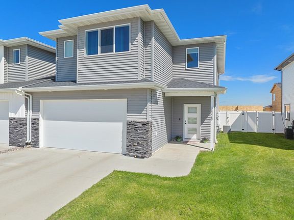 Welcome home to sleek, modern, convenient, simple living! This striking townhome located in Northwest Minot in up-and-coming Highlands at North Hill with easy access to the bypass and a quick drive to South Minot and a straight shot to Minot Air Force Base, is the perfect place to call home. The low maintenance yard, two stall garage, privacy fence, and durable exterior and interior finishes make this the perfect first or fifth home. Inside you are greeted by a generous entry with luxury vinyl plank flooring throughout the main floor. The conveniently located main floor powder room is perfect for dinner guests. The open concept living, dining, and kitchen area with high ceilings, cozy fireplace, large windows, quartz countertops, spacious pantry, and ample closet space is perfect for entertaining or enjoying an evening at home. Upstairs you will love the secondary living area with additional bathroom and enormous laundry room. Two secondary bedrooms mirror each other, but do not share a wall making for peaceful nights. The enormous primary bedroom with gorgeous west facing views boasts a walk-in closet and a fantastic en suite bathroom with dual vanity, soaking tub, and shower. Call for a showing today!