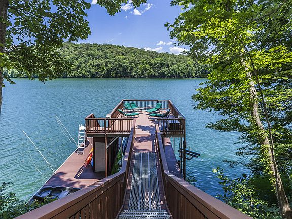 LAKEFRONT custom, all brick hm on a secluded 1.79 acre lot on Melton Hill Lake- A haven for water sport enthusiasts due to the calmer, deep water. Upper level of boat dock is a wonderful party deck! Lower dock has a slide, boat dock slip & lift, a jet ski lift & room for fishing. 17 feet deep year round at the dock. Inside the 2 sty, bsmt hm you will find Cherry Hardwood floors through much of the main lvl, a 2 sty Gr rm w'a wall of windows that has pass thru to kitchen that is graced with Cust Cherry cabs & granite c'tops. Vlt'd sunroom. Mstr on main w'remodeled bathroom. 3 beds up w' 2 baths. Lg Fam rm in basement plus rec rm, kitchen, bathroom, ex rm & one other rm. Lots of outside decks & patios. W'ful locn only 10-15 mins to Turkey Cr but surrounded by wildlife, water & woods!