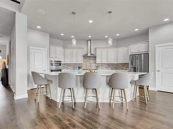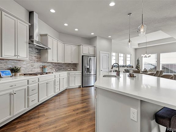 Gorgeous half acre home in the sought after Inspiration neighborhood! Only 5 years old, this “smart home” shows like a model featuring a spacious open floor plan, extensive wood flooring, soaring vaulted ceilings, and an abundance of windows which bathe the home in natural light. The gorgeous white kitchen is a chefs dream with a huge center island that seats 6, loads of counter and cabinet space, quartz counters, glass tile backsplash, gas range, an advantium micro-oven cooking system, and 2 separate walk in pantries. A bright breakfast nook and spacious great room flank the kitchen and provide a warm gathering space for family and friends. The great room boasts 2 story ceilings, an ambient central fireplace, and a sophisticated surround sound system for an elevated TV watching experience. Hard to find main floor primary suite is a dream with 10’ ceilings, en suite bath with custom vanity for added storage and his/hers walk in closets. Second main floor guest suite with private en suite bath which is ideal for guests or aging relatives. Well appointed main floor office with French doors and a fantastic mudroom with built in storage bench/coat rack round out the main floor. Up the grand staircase, you will find a functional loft living area and 2 additional large bedrooms and a well equipped full bath. The full garden level basement is mostly unfinished, but does offer gym space and a media room with overhead projector and movie screen included. The finished 4 car garage with epoxy floors offers plenty of space for the car enthusiast. The separate 4th bay is 26 ft deep and features a custom built in storage system. Wait till you see the backyard! An entertainers dream with a large covered deck, surround sound speakers, a custom fire pit, stone privacy wall, Sundance Spa, and an abundance of mature trees. Enjoy quick, easy access to Parker’s Mainstreet, Southlands Mall, Park Meadows, DTC & DIA. Priced to sell!