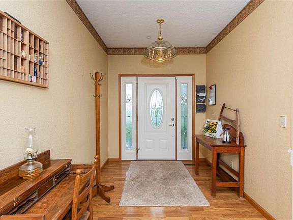 Step into this stunning open-concept layout. The spacious kitchen seamlessly flows into the family room, boasting custom cabinetry that extends throughout the home. Built to exacting standards in 2004, this residence features a grand master suite upstairs with dual walk-in closets and a luxurious master bath. On the main level, discover two bedrooms alongside a versatile third room perfect for use as an additional bedroom, crafting space, or cozy TV room. The lower level offers a fantastic recreational area complete with a wet bar, walkout access, and a secure storm shelter. Enjoy comfort year-round with two heat pumps and two central air systems, complemented by partial floor heating on both upstairs and downstairs levels. Tinted Anderson windows, double-tinted on the west side, enhance energy efficiency. Fire safety sprinkler system expanding through the entire house. The screened-in porch invites serene moments outdoors. The three-level deck, featuring newly installed spindles on the railings, overlooks the sprawling 3.2-acre lot. Adding to the appeal is a sizable 40X62 building with a half bath, heated floors at the front, and a picturesque view of both a small pond on the property and a neighboring pond. Conveniently located just beyond city limits on a blacktop road, this residence offers the perfect blend of tranquility and accessibility.