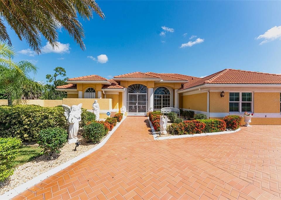 NOW ACCEPTING BACK-UP OFFERS! Port Charlotte Section 15 Spanish-Mediterranean Pool Home with Over 2,800 Sq. Ft. on a Double Lot in X-Flood Zone. This stunning 3-bedroom, 2.5-bath home offers over 2,800 sq. ft. of living space and blends timeless Spanish-Mediterranean architecture with modern upgrades. Located in Section 15 in Port Charlotte, this home is close to retail shopping, numerous restaurants, downtown Punta Gorda, Port Charlotte Town Center Mall, the Punta Gorda Airport and the Sunseeker Resort. For outdoor enthusiasts, the Harold Avenue Park and the Audubon-Pennington Nature Park are close by and it's only a short drive to the beaches of Englewood and Boca Grande. Step inside to an open floor plan with cathedral ceilings throughout and elegant archways that define the main living areas. The split-bedroom layout ensures privacy, while the spacious primary suite features two large walk-in closets and a luxurious en-suite bathroom. At the heart of the home is a large bonus room currently being used as a game room—perfect for entertaining, and the pool table conveys to the new owners. Sliding glass doors open to an expansive screened lanai with a heated pool, a dedicated pool bath, and new cool deck coating for barefoot comfort. This home has been updated with a new roof (2022), updated stainless steel kitchen appliances, a newer water heater and HVAC system—offering peace of mind and modern efficiency. Outdoors, the double lot is framed by a masonry wall on the sides and a chain link fence by the canal at the rear—creating both privacy and a picturesque setting. A gated circular driveway and a three-car garage provide ample parking and storage. Additional features include hurricane protection with shutters for all windows (except impact-rated) and electric roll-down shutters for all sliding doors, open-concept kitchen and living spaces for seamless entertaining and a spacious yard with plenty of room for pets or outdoor activities. This home combines Mediterranean character with Florida practicality—a rare find offering exceptional privacy, convenience, and style.