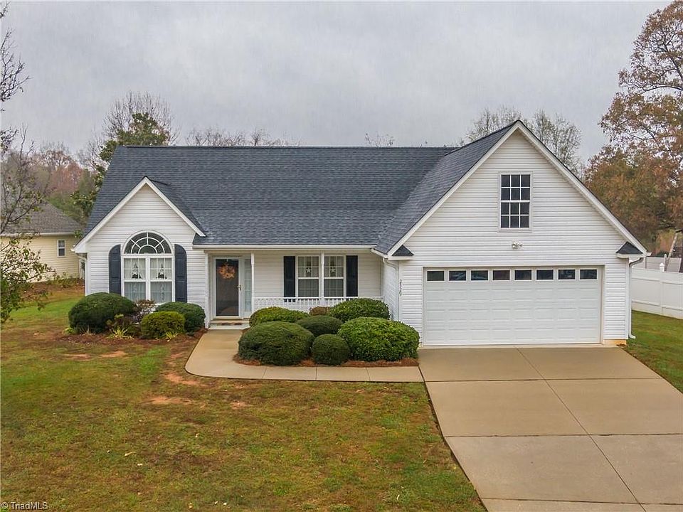 Looking for the elusive one story split floor plan with ample natural light, Vaulted ceilings, open floor plan and convenient to shopping, airport and all the amenities of the Triad. Well, Here it is! This is a well maintained one owner property. All on a single level, this home is perfect for you! Living room has gas fireplace, vaulted ceiling and access to patio through French doors. The kitchen (refrigerator to remain) with Oak cabinets and its own dinette area and a Bay window is adjacent to the living area. This home even has a formal dining area. Could be used as a den, or home office. The choice could be yours. Primary bedroom with en-suite bath. Tub and separate shower, double sink vanity, walk in closet. 2 additional bedrooms on the opposite side of the home. One with vaulted ceiling and both a very nice size. Full bathroom for these 2 bedrooms. Laundry room and (seller says washer and dryer to remain) Interior access to attached 2 car garage. Draperies/rods do not remain.