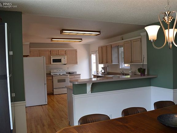 This charming one level home is move in ready! It has been so well cared for and completely updated. You'll appreciate the bright and open living room and beautiful hardwood floors. Everyone will want to gather there, or in the huge remodeled kitchen with spacious dining room. There is also a large laundry room, and a work shop/storage room with work bench. Enjoy the large fenced back yard with fruit trees and large composite wood deck. Great place to enjoy that morning coffee or relax with friends or family. Completely remodeled and updated including: Remodeled Kitchen with newer appliances, Champion windows, new R49 insulation in the attic, newer furnace & water heater, upgraded electric panel, newer roof and hookups for your hot tub. There is a great alley in back and room to build a detached garage. There is a 'winter view' of Pikes Peak and a covered front porch to enjoy those cool evenings. Low maintanance home with stucco exterior and vinyl soffits. This is one of the largest 3 bedroom one level plans in this very popular neighborhood. It is close to everything including Patty Jewitt golf course, schools, shopping and Rock Island Trail.