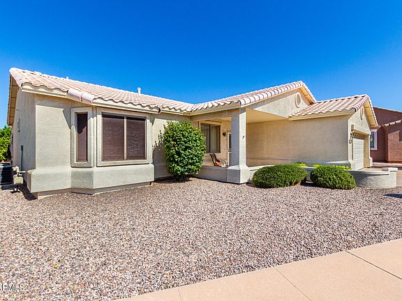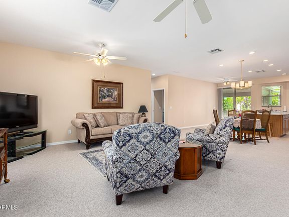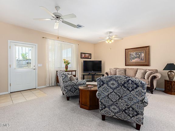 Large master bedroom, master bath w/shower, & huge master closet. 2 roomy secondary bedrooms share bath on other side of home for privacy with guests. Enjoy your morning coffee on your covered front patio or your private shaded back patio. Large great room, dining area, kitchen. Kitchen has loads of cabinets , pullout shelves & a kitchen island. The large Arizona room (not included in sq footage description) is accessed off the kitchen and is serviced by an air conditioner. Large laundry room w/cabinets, sink & storage/pantry. The 2 car garage has an A/C to allow you to tinker on your projects. The garage door is insulated & has a bank of built in cabinets.