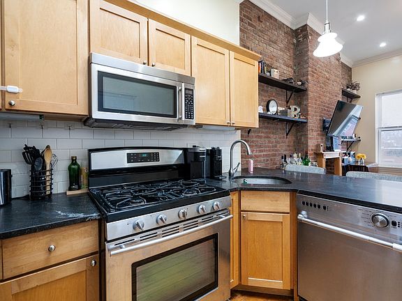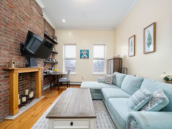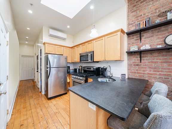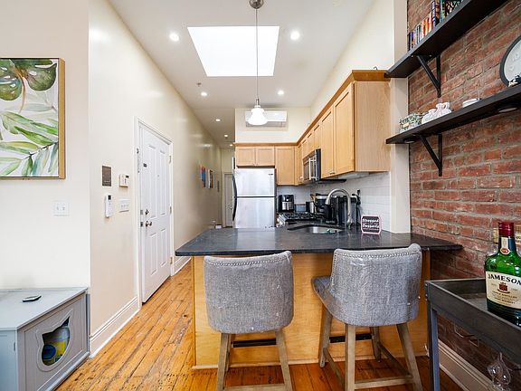 Welcome to 233 Third St. in Downtown Jersey City. This spacious and bright one bedroom and one bath condo on the top floor of the building is located on a tree lined picturesque street in the heart of Downtown Jersey City. City chic living at its best! The open concept contemporary kitchen offers a skylight that floods the kitchen with natural light. Also, stainless steel appliances and honed granite countertops with breakfast bar. Kitchen opens to a graciously sized living room complete with oversized windows as well as an exposed brick wall and fireplace. The spacious master bedroom has exposed brick wall, ample closet space and a separate alcove that can be used as a home office. The bathroom also has an exposed brick wall, marble floors and subway tile. Other features include wide plank original hardwood flooring throughout, washer and dryer in the unit, central air conditioning, crown molding and high ceilings with recessed lighting. Also, new items - washer and dryer, hot water heater and air conditioner unit. More great features - a private storage locker as well as a common backyard complete with patio furniture and a grill. PLUS - roof rights to half the roof. This home is conveniently located in the heart of Downtown Jersey City. It is convenient to the Grove St. Path. Convenient to your favorite breakfast place Scram or Dames Coffee Espresso Bar. A few blocks to either Hamilton Park or Van Vorst Park. Also, close to everything Downtown Jersey City has to offer - a wide variety of restaurants, coffee shops, stores, fitness centers and more! Don't delay! Call today for your personal tour of 233 Third St., Apartment #8 in Downtown Jersey City.