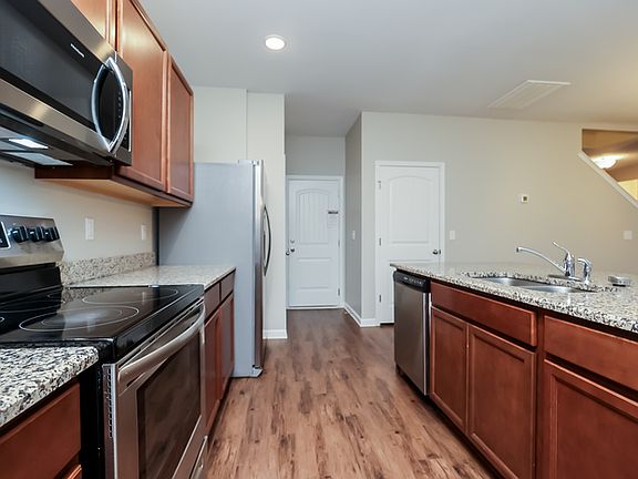 Step inside to find a bright and open floor plan highlighted by fresh flooring and natural light throughout. The spacious living room is anchored by a corner focal point and large windows, creating a warm and inviting atmosphere. The kitchen features stainless steel appliances, rich wood cabinetry, and granite-style countertops that complement the sleek flooring. An island adds extra prep space and connects seamlessly to the dining area, perfect for casual meals or entertaining.