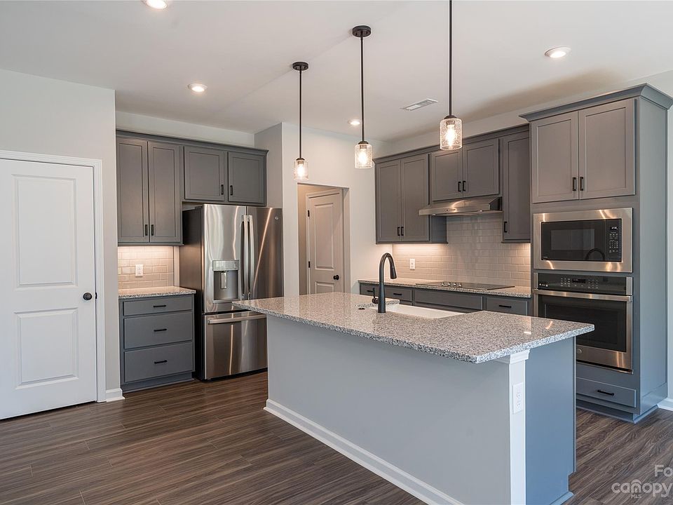 The kitchen has the gourmet kitchen upgrade with a 36" electric range, elevated stainless steel appliances, white cast iron farmhouse sink, greyhound cabinets, desert gray backsplash tile, all tied together by the beautiful Luna Pearl granite counter tops. The great room and dining room then flow together into the 8' tall sliding glass door connecting you the one-of-a-kind extended paver patio space overlooking mature trees.