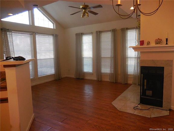 One level living all on first floor. You won't have to walk up with groceries! Bright, light and open floor plan! Laminate flooring in all rooms except kitchen and baths. Cathedral ceilings, fireplace, private bathrooms off each bedroom, "Jacuzzi type" tub for those who want to soak. Washer/dryer in unit, all kitchen appliances, newer lights, extra storage above living room plus outside storage area, and central air. Your amenities are amazing with pool, clubhouse, basketball court, tennis court, hot tub, exercise room, and sauna. Close to Rt.9 and I-91- and medical facilities and shopping.