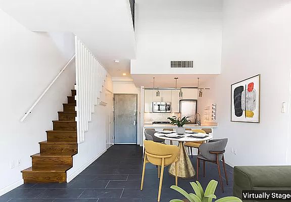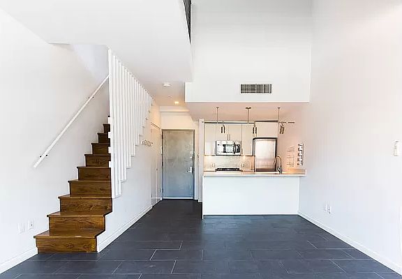 New to market: Amazing 2 bedroom/1 bath condo duplex in East Williamsburg. This spacious industrial loft-like duplex has a large balcony, an in-unit W/D, and high ceilings. The stylish kitchen has stainless steel appliances and backsplash, dishwasher, custom cabinets, Caesarstone countertops, and a center island with an overhang for seating. The bathroom has a Kohler deep soaking tub, Toto toilet, classic tiles with fun blue accent tiles. Other great features of this bright apartment include the highly efficient central A/C and heat, instant hot water heater, and a compact boiler. Ahead of its time, The Trillium was built with a green roof with a rainwater retention system, solar panels that power the building's common areas, and a bike storage room. This Williamsburg condo building is centrally located three blocks from both the Graham Avenue and Grand Avenue L stops for easy commuting into Manhattan or further into Brooklyn. Only 1 flight up in a non-elevator building. Vibrant Cooper Park is 3 blocks away with a dog run, basketball courts, tennis courts, skate park, and playgrounds. What a cool place to call home!