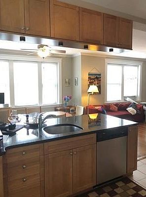 this renovated, top-floor unit in a prime location near Coolidge Corner has everything you could ask for: in-unit washer/dryer, dishwasher and garbage disposal, plentiful closet space and a dedicated parking spot directly in front of the building! This end/corner unit has windows on three exposures for tons of natural light throughout the day, and boasts a large open-floorplan living space. The kitchen is fully-equipped with granite, stainless appliances, gas cooking and a breakfast bar that opens to the dining and living areas. The master is very large, currently set up with a home office on one side. A second bedroom and two renovated bathrooms, as well as additional pantry/closet space complete the unit. A/C window units provided by landlord. Heat and hot water included.