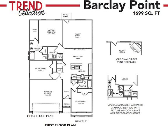 The Barclay Point, part of the Trend Collection by Ball Homes, is an open layout ranch plan with three bedrooms. This semi-split bedroom design places one bedroom and the hall bath off the entry, and the primary bedroom suite and additional bedroom on the other side of the home. The kitchen is at the heart of the home and offers both a breakfast area and countertop dining at the island. Granite kitchen counter tops with stainless steel 50/50 under-mount sink and full back splash. The kitchen opens to the family room at the rear of the home. The primary bedroom suite includes a bedroom with large closet and spacious bath with tub/shower, transom window, and linen storage. Raised vanities in baths and 12x10 concrete patio.