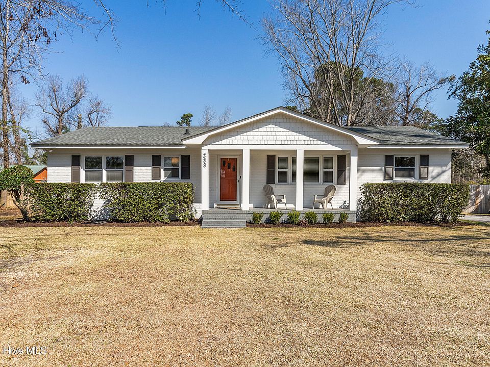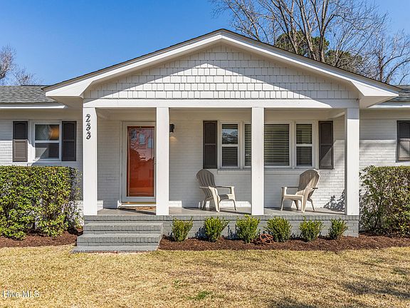 Enter through the covered front porch to the foyer with living room and kitchen to your right, with the dining area adjacent behind the kitchen. The kitchen boasts stainless steel appliances, sleek stone countertops, a tile backsplash, and fresh light fixtures. The primary bedroom with bathroom is located in the front left corner of the home and across the hall three bedrooms line the rear of the home. Both bathrooms have been completely upgraded with stylish new tile and plumbing fixtures. The home features a 3-year-old roof, updated flooring and windows, and a beautifully renovated and freshly painted interior. Additionally, there is updated plumbing, an upgraded 220-amp electric service, and encapsulated crawlspace.