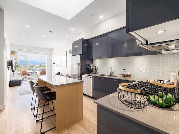 STUNNING, QUIET, and HUGE ROOFTOP DECK! Get ready for your Summer gatherings showcasing beautiful PANORAMIC city and mountain views. Live in this immaculate two level 1 bed +den/1.5 bath home in the heart of Mount Pleasant at Vya! Outstanding kitchen w/SS appliances, quartz countertop and large island is a chef's dream! Appreciate the open floor concept with over height ceilings, large windows with incredible skylight bringing in natural light, and beautiful wide plank flooring throughout the home. The loft/den is ideal for a home office. The gorgeous 500sqft NE private rooftop deck is spacious for all your needs; raised garden bed, bbq, dining and lounge area. 2 parking and storage. Amenities include large lounge with kitchen and pool table and a outdoor space.