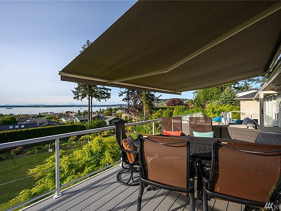 Spectacular Edgemoor home with sweeping views of Fairhaven, Bellingham Bay & The Canadian Mountains from the entry & living areas. Built for entertaining with beautiful bar and floor to ceiling windows. In 2014 an addition of a main floor master suite was complete, as well as finishing the basement with a 2nd master suite. Enjoy evenings on the newer composition deck with natural gas piped-in fire pit and a large automated retractable awning for those sunny days. Well maintained large backyard with sprinkler system. Enjoy negligible power bills with newly installed solar panels. Newer flooring, lighting, slab granite counters & high end stainless appliances. Beautiful brick patio, with a BBQ area & heated garden storage room.