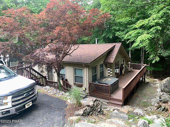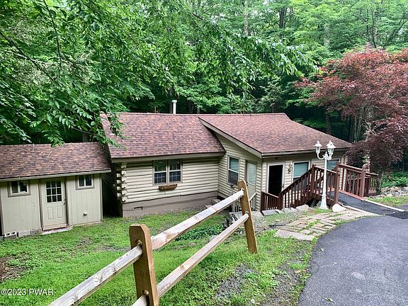 Real log cabin exudes rustic charm and is located in a 5 star award winning Poconos community! The home has been recently renovated including a brand new roof, new granite kitchen, new floors, appliances and more. The home features 1 dedicated bedroom and a pull down murphy bed in the open concept great room so 4 people are accommodated comfortably. Located just a short distance from the North recreation swimming pool, the Hideout golf course and restaurant and the indoor sports complex. The property borders a 320 acre private preserve so privacy abounds at the back yard firepit and the front paved driveway has parking for several cars. This is a chance to own a real log home at an affordable price and the community amenities are wonderful., Beds Description: 1Bed1st, Baths: 1 Bath Level 1, Sewer: WS Comm Central