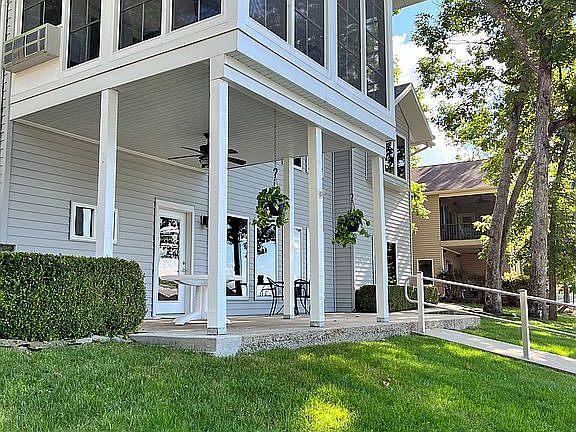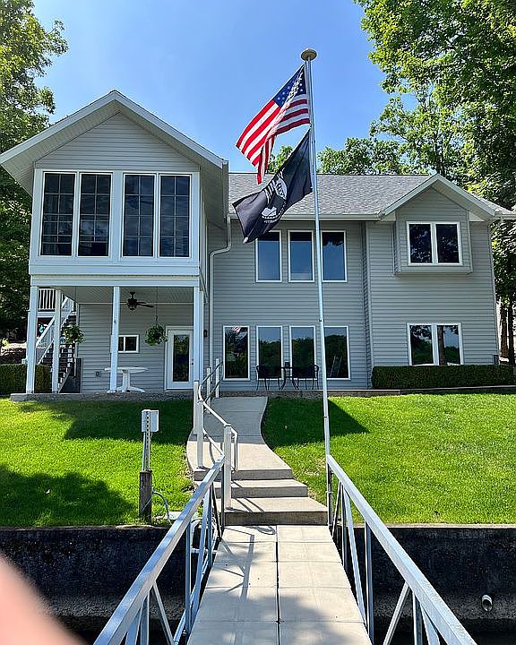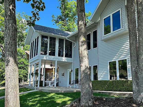 BEAUTIFUL 3200 SQ. FT. CUSTOM WATERFRONT! Quiet cove location with main channel view. Reverse walk-out with total living on entry level. Hardwood floors, crown molding, custom cabinets, huge island, 3 season sunroom with heat and air, and composite decking. Tall vanities, lower level has wet bar for entertaining, 3 car oversize garage with sealed divider wall between stalls with own heat and air. A new roof was installed March of 2024 and new house heat and air was replaced in June 2019. Concrete dock has a wet step, dock locker and seating area with a 10 x 28 slip, 10 x 26 slip and a jet ski slip. Dock has fresh water, fish cleaning station, and lake water irrigation pump for the lawn. Easy access to dock with only 4 steps from patio to dock ramp. This house can be a VRBO.