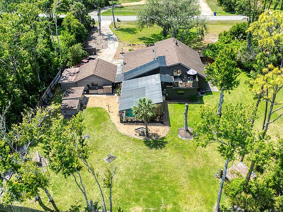 Welcome to your own private oasis close to town! Over an acre of gorgeous land with a fully fenced backyard, a caged pool and outdoor storage galore. 2020 roof, 2024 HVAC, 2025 HWH. Located in the highly sought after Riverbend Acres. This Estate flaunts 5 outdoor decks made with Trex composite decking. The interior of the home is ideally designed offering three family rooms and an enclosed bonus room. The spacious kitchen is the center of the home with ample counter space and a walk in pantry. You will fall in love with the stunning view of the front yard where you can keep watch on the resident blue birds. The master retreat encompasses the entire second floor with two private decks and a large den. All the bedrooms feature walk-in closets. Step outside and you'll find a grand lanai with an expansive pool, enclosed outdoor entertaining areas with power and a truly private backyard oasis. There are multiple fully enclosed outdoor storage areas for all your toys and tools. This property is located in the minimal flood zone X, close to I95, 7 miles to the ocean and less than a mile to restaurants and stores. No listing sign in the yard.