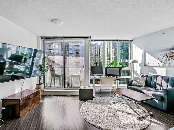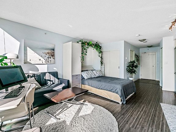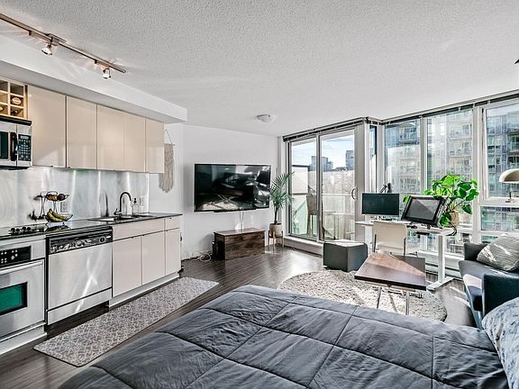BREATHTAKING WATER & CITY VIEWS from this BRIGHT & SPACIOUS home in the heart of downtown. Perfectly designed studio at TV Towers feat. floor-to-ceiling windows (tons of natural light!), H/W flooring & sky-high outdoor space. Open linear kitchen w/ S/S appliances & backsplash as well as contemporary cabinetry. Functional floorplan w/ murphy bed leaves generous living, dining & entertaining space. Spa-like bath w/ modern vanity & deep soaker tub. Solid CONCRETE bldg w/ proactive strata and world class amenities incl. concierge, hottub, sauna, steam & gym. Incredible location, steps from Amazon's new HQ, Robson Street & the Seawall & the best parks, nightlife & shopping on offer in Yaletown. Pets & Rentals OK. Perfect for homeowners & investors! Showings by private appt. Hurry!