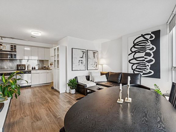 Gorgeous city viewsNew floorsSleek linear kitchenSmooth cooktopFull height windowsLovely natural lighting