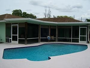 Wow..Here's one not to miss! Wonderfull, updated and well maintained CBS pool home! Crown molding throughout; tile floors in living areas; wood flooring in owner suite. Custom cabs. Eat-n-Kitchen has butler bar with overhd cabinets. Kitchen has custom ceiling with spot lighting, pull outs in some cab's; pass thru at sink to patio; tiled counters. OBath has tiled, over-sized walk-in shower. Cabana/GBath has custom cabs with dual sinks, and built-in linen cabs. West side of home has sliders that push all the way back for cross breezes! Step out to a screened and covered patio. (Amazing entertaining space!) Walk out to the pool and low-maintenance backyard beauty! Yards are fully sprinkled & fenced back. Windows have accord. shutters('05)**Roof('04)**Porch roof('13)**Ext.paint('13)+ more...