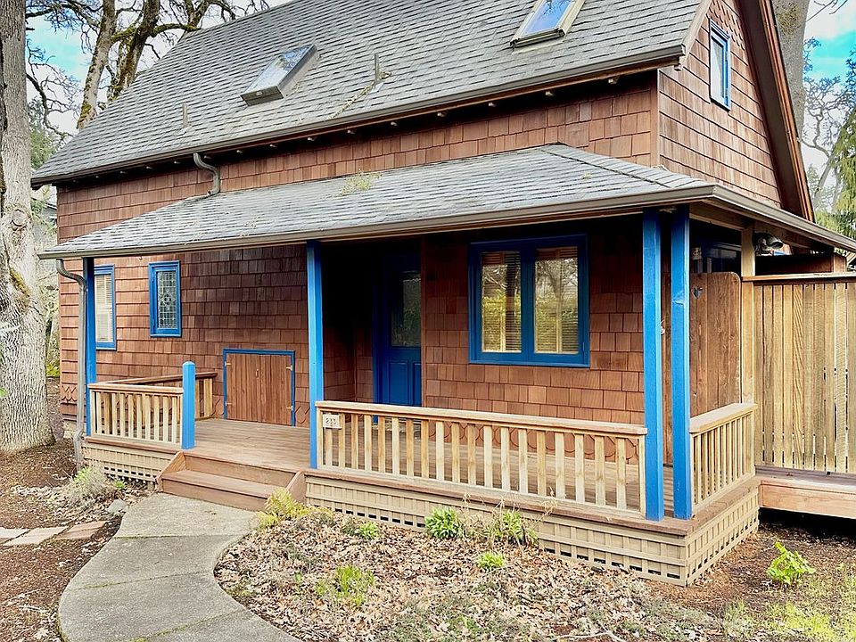 Walk to the golf course from this attractive cottage on its own lot in quiet wooded setting. Tastefully designed with wood accents throughout, this home features open vaulted ceiling with skylights, wood framed double pane windows thruout. Flexible floorplan presently used as living room, family room, office, 1/2 bath, kitchen plus dining area on main floor, and master bedroom, walk-in closet, laundry, and full bath on the upper floor. Solid oak hardwood floors thruout. Mini-split heating and AC. Inspection and completed repairs available on request.